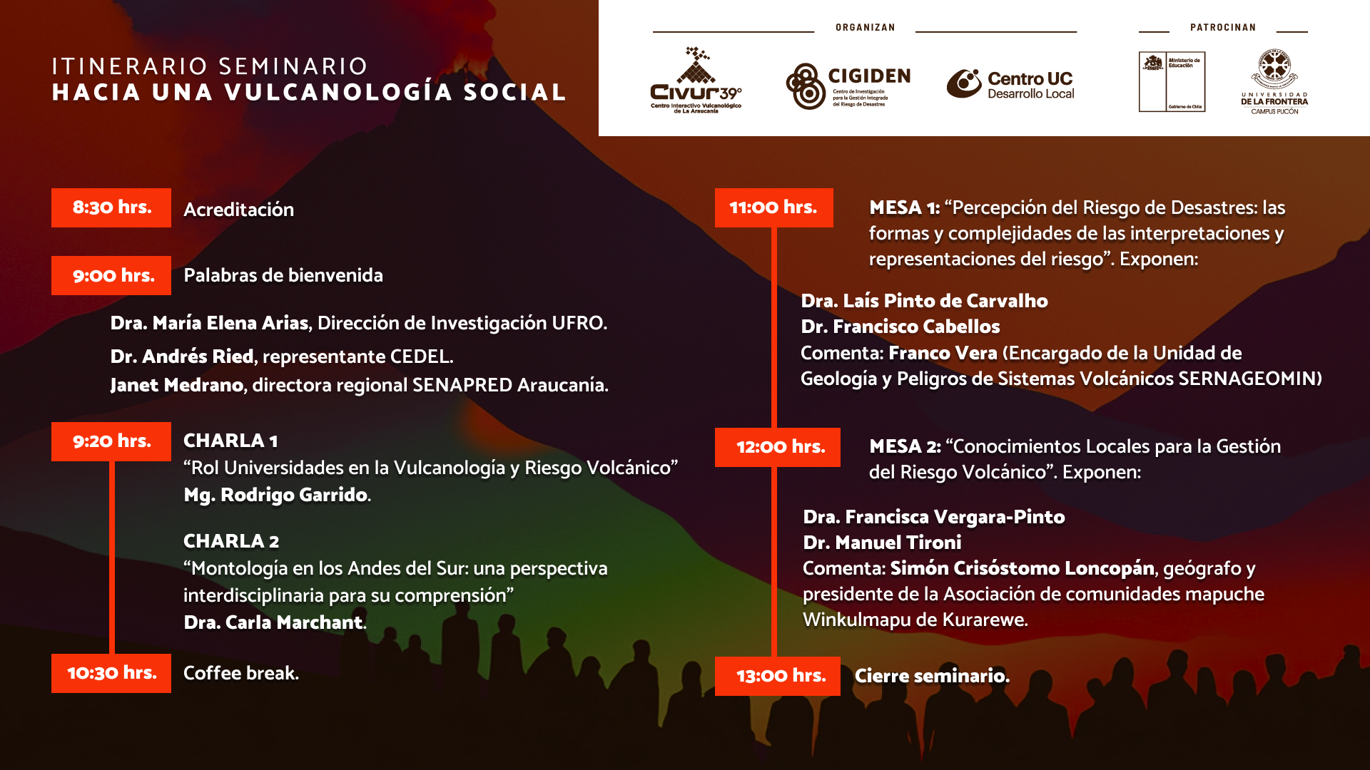 Organizado conjuntamente por CIVUR-39º, CIGIDEN y Cedel UC, este seminario interdisciplinario tiene el objetivo de discutir respecto de dimensiones culturales y territoriales de la vulcanología y la gestión de riesgo volcánico en el contexto geo-social e histórico de los Andes del Sur.
